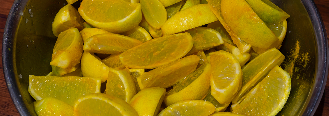 Place in a large bowl and add the salt, turmeric and 1 ½ tablespoons of vinegar. Mix thoroughly to ensure the lime pieces are coated.