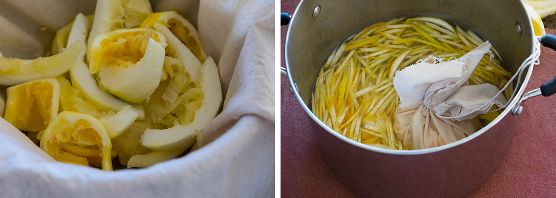 - To make the cloth bag, drape a square of muslin or calico over a basin. Place the pips and membrane mixture into the cloth. Draw all the edges together and tie with kitchen string. The pips and pith have high pectin content. The addition of some pith will assist the setting process. The more white pith added to the cloth bag, the bitterer the final marmalade will be.