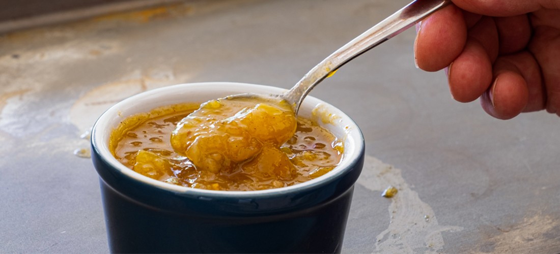 • To test the chutney is cooked to the right consistency, spoon a little of the mixture on to a plate. The chutney should hold its shape.