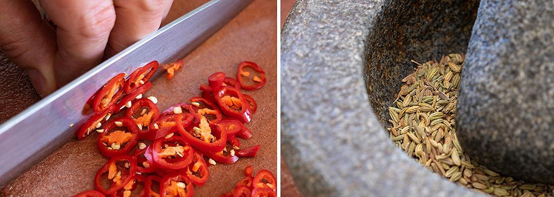 • It is important to wash your hands thoroughly after handling and de-seeding chillies. Chilli oil is easily transferred from the chillies to hands. If you touch your eyes or any delicate areas, the chilli oil will be transferred on contact and create a burning sensation.