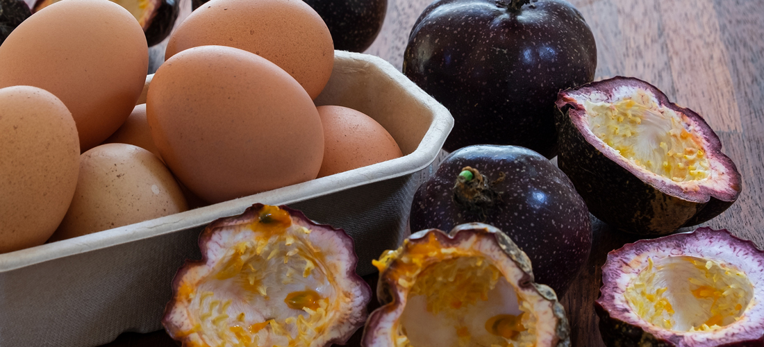 Fruit curds, with their creamy velveteen consistency, vibrant colour and touch of tang are utterly irresistible. It's springtime and there are plenty of eggs after the chooks winter moult and the deep purple passionfruit have ripened to perfection. The vine is laden, the fruit heavy and as the protective shell is split, an intense orange pulp with masses of black seeds, each surrounded by a small sac of precious juice is revealed with a gospel sign. Their taste, strong and tart with a penetrating fruity aroma marry perfectly with the rich melange of fresh home-grown eggs and creamy butter.