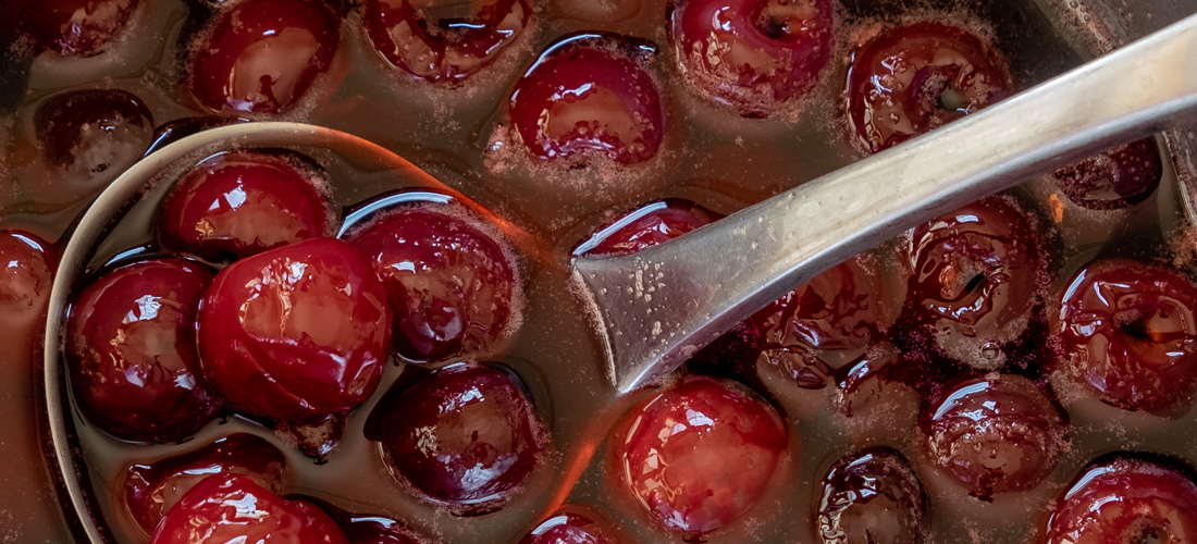 Remove from the heat. Using a stainless-steel spoon transfer the whole cherries to dry sterilised jars. Do not over fill the jars at this point.