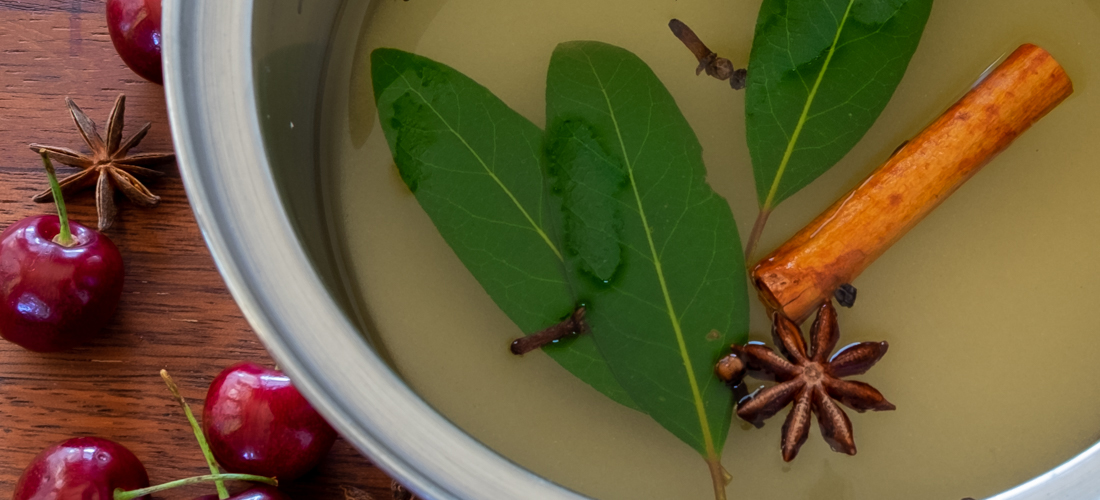 Add the cloves, bay leaves, cinnamon quill, and star anise. Simmer gently with the lid on for approximately 15 minutes to extract the flavours.