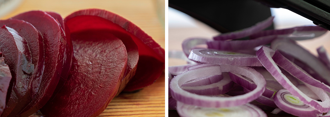 - I use a mandoline to slice the beetroot and oions, so they are the same width.