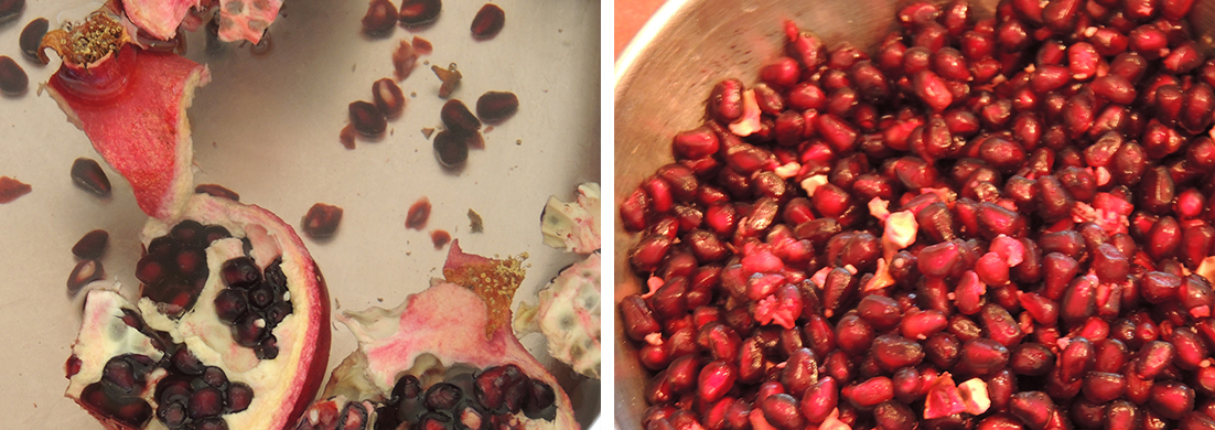 Cut the pomegranates in half and pull the inner membranes that contain the seeds apart and drop into a container of clean fresh cold water. Gently wash the seeds, being careful not to crush them as this will release the juice into the water. Separate the seeds from the membrane and discard it and the skin.