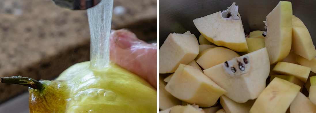 Gently wash the quinces to remove the soft down covering the fruit. Without peeling or removing the pips, cut into pieces approximately 4 to 5 cm.