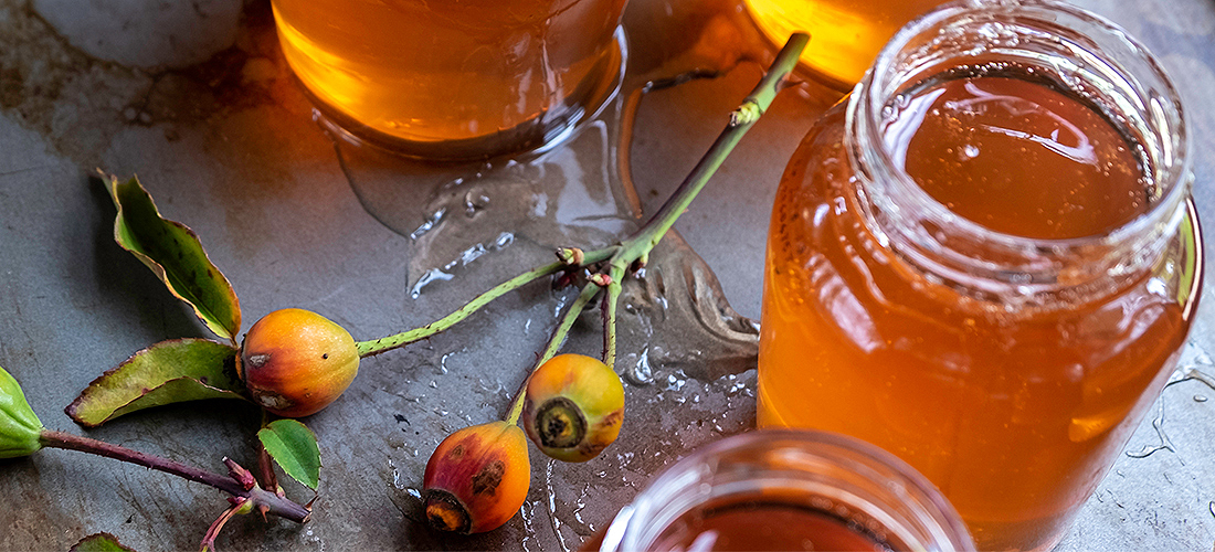 Rosehip jelly is a star, served either as a sweet spread or as an accompaniment to white meats. Foraging for wild rosehips or collecting them from the garden is an autumn and winter treat. As it glistens, it reminds me of the wonder and power of nature: providing food in so many different forms. Jellies might take a little longer to make than jam, but the wait is well worth it. A perfect autumn preserve when apples and rosehips are in abundance.