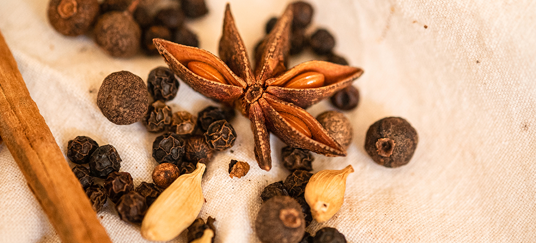 Create a spice bag by placing allspice berries, cinnamon stick, black peppercorns, star anise and green cardamom pods in calico cloth. Secure tightly with cooking twine. Put aside for later use.