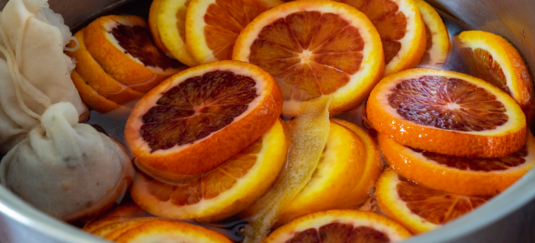 Place the vinegar, sugar, and spice bag in a saucepan. Heat gently, stirring occasionally, to dissolve the sugar. Then bring to the boil and add the sliced orange to the pan and simmer gently until the peel is tender, approximately 20 minutes.