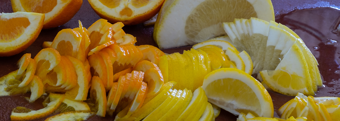 Remove the ends from the fruit and put aside. Quarter the oranges and lemons and cut the grapefruit into eighths. Slice finely.