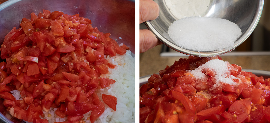 - The 2-hour marinating time can be extended. If it is left to marinate overnight, it should be refrigerated. Salting the tomatoes and onions draws out excess water. This is drained off and discarded. Removing the excess water considerably reduces the cooking time required to achieve a naturally thickened consistency.